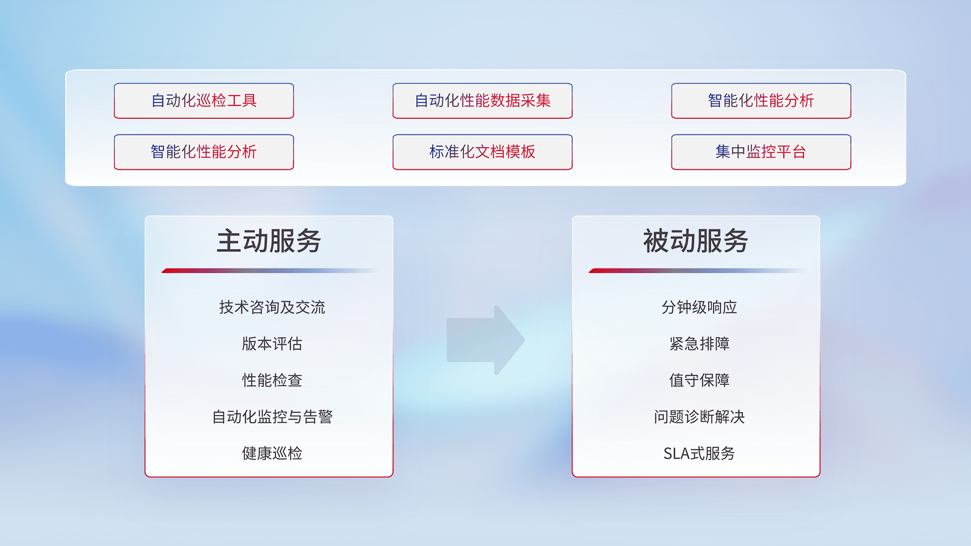 智能化工具和标准化文档,,,,保障服务质量,,,提供主动服务(包含技术咨询、、、、版本评估、、、、性能检查、、自动化监控与告警、、健康巡检)和被动服务包含(分钟级响应、、紧急排障、、值守保障、、问题诊断解决、、、、SLA服务)。。
