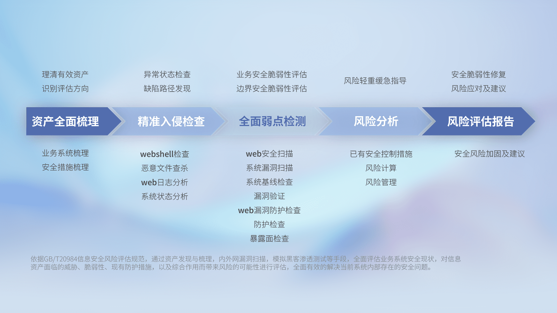针对客户行业特性,,,,以专业的安全服务+多厂商联合解决方案提供专属的一站式安全管理服务,,帮助客户全面感知网络空间威胁,,,,基于识别、、检测、、、分析、、防护、、、监测、、、、响应的服务理论模型,,,从方案咨询、、集成交付、、、、评估验证、、优化加固、、、运维运营,,,,致力于为客户提供完整的闭环管理式安全服务。。。。以实战经验为客户打造高抵御风险的安全体系,,,帮助客户发现威胁、、、、对抗威胁、、、处置威胁,,,,不断积累安全对抗能力,,持续保障数字化安全。。。。